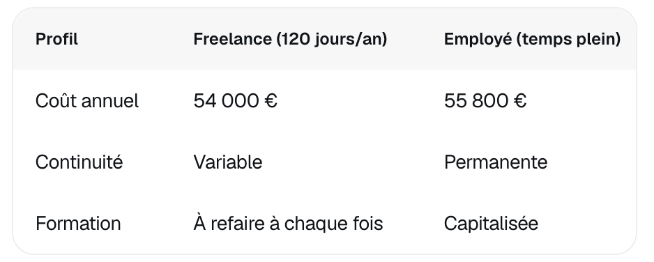 A freelancer working 50% of the time costs €54,000 per year , almost the same as a full-time employee.